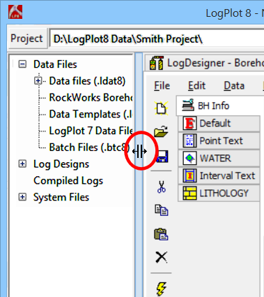The Project Manager is displayed in a pane along the left edge of the LogPlot program window. It is used to display the LogPlot-related files in the current project folder, and allow you to open them easily with a simple double-click.