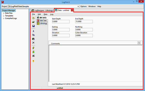 Data Editor Window: A blank Data Editor window will be opened upon program startup. The Data Editor is used to enter or import the descriptive, textual, quantitative, or other data to be displayed on the log. Within the Data Editor itself, the different types of data are also organized into tabbed datasheets. You can have multiple data files open at any time. The data structure is discussed in the section "Entering Your Data."