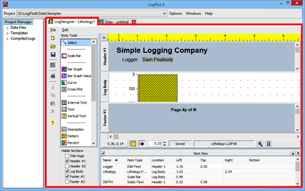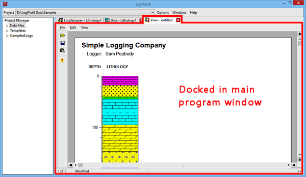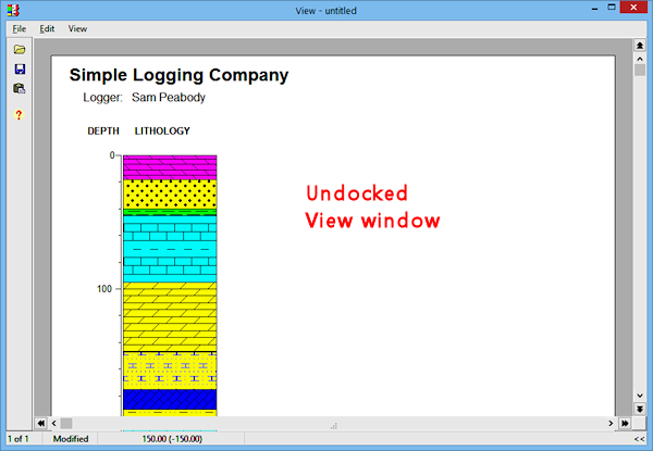 View Window: The LogView window is used to display the compiled logs, either in a "docked" tab in the main window, or in a separate, stand-alone window. Each time you compile a log, it will be displayed automatically in a new LogView tab or window. From there you can save, print and export the graphic logs. You can have multiple LogView windows open at a time. See "Viewing and Manipulating Logs" for details about the View window.