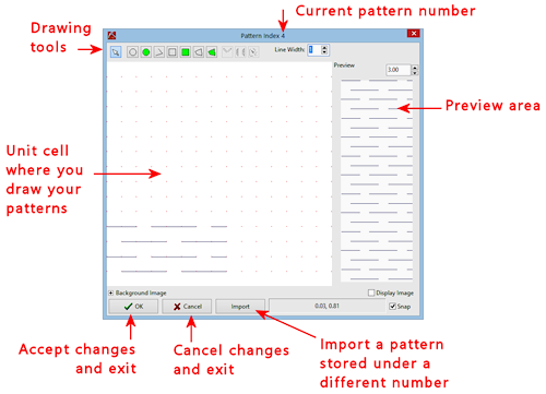 Here's a summary of what the Pattern Editor window contains; these tools are discussed in the How-to topics below.