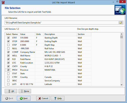 The program will read the sample LAS file. It will load the header information in the lower pane of the window.