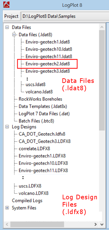 - Since the Project Manager pane still lists all of the sample data, expand the Data Files heading and locate the file "Enviro-geotech2.ldat8". Double-click on that file name to open it into the data editor.