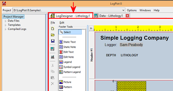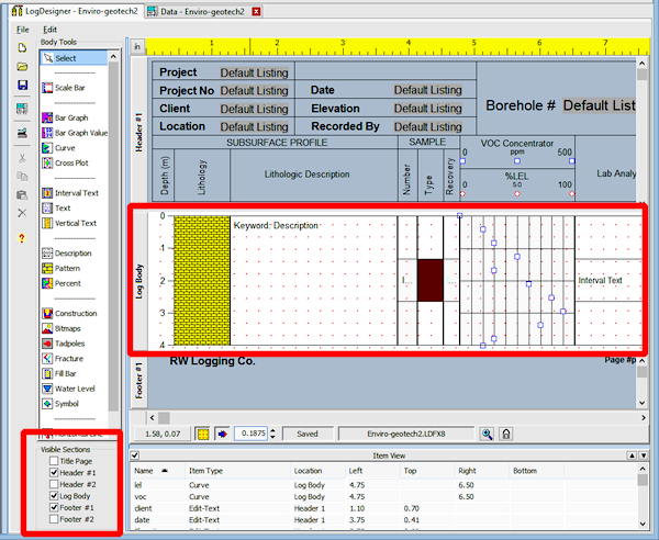Here you’ll see small snapshots of the environmental/geotechnical log designs that are shipped with the program. Each snapshot has a "see bigger" link to display a larger image. We’ll be modifying the "Enviro-geotech2" design.
