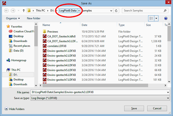 - In the displayed window, browse up one folder level to the LogPlot8 Data folder by clicking on the folder name at the top of the window.