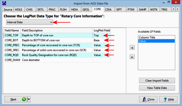 - Available LP Fields: This pane, along the right side of the window, will display the LogPlot Interval Data fields which you can associate with the AGS data fields.
