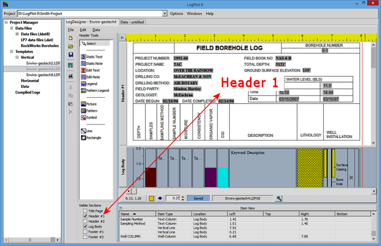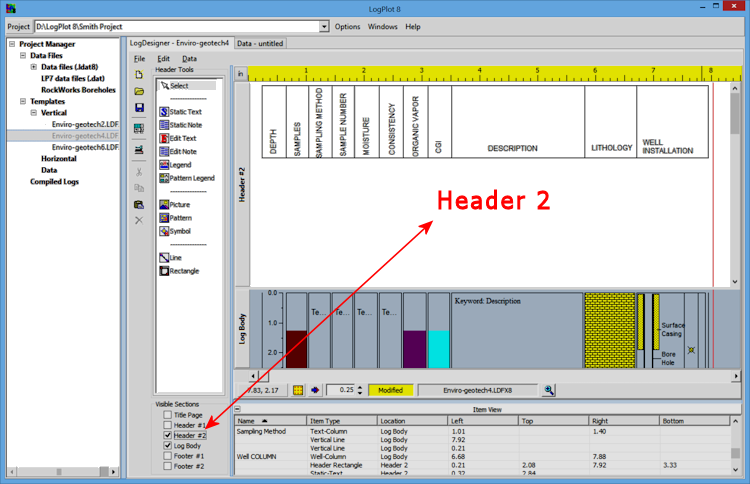 To view or design the first header, for example, insert a check in the Header 1 checkbox, and that will be displayed in a design pane at the top of the window. To view/design Footer 2, insert a check in that item, and it will be displayed in a pane near the bottom of the window. You can display as many design panes as you want at the same time, bearing in mind that the size of the LogPlot program window will limit the size of each design pane.