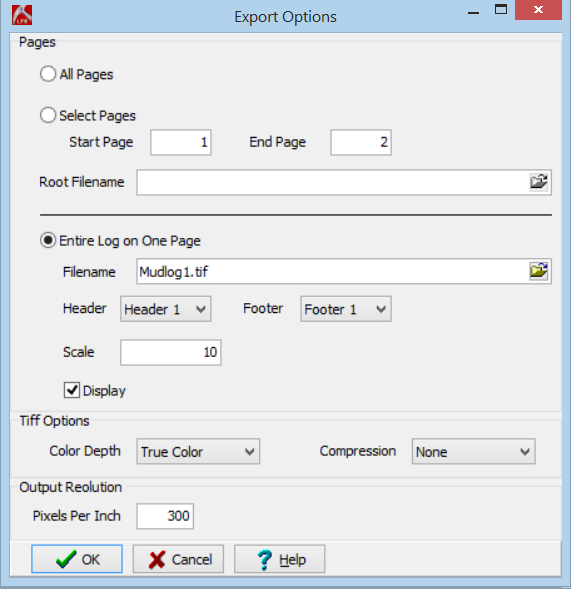 The program will export this long log image to a TIFF graphic, and store it on disk under the name "Mudlog1.tif". You can insert this image into most word processing documents, many raster log programs, etc.