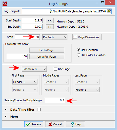 Continuous: Be sure the page layout is set to Continous, so that the log pages will chain together with no breaks. A header will plot only at the top of the first page, and a footer at the end of the log.