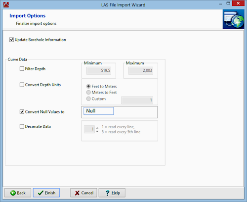For this section, be sure the Convert Null Values item is checked so that any null values in the LAS file will be replaced by a specified value. In the prompt box type in the characters: NULL. This tells LogPlot to skip these records during import.