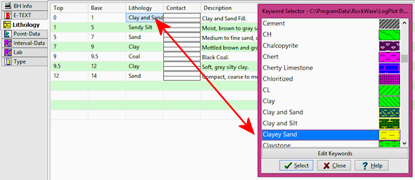 - Scroll down to "Clayey Sand" and click on that term. Note how the pattern changes for this rock type. Then click on the Select button to record that keyword, and then on the Close button to close the window. Now "Clayey Sand" is defined for this depth interval.
