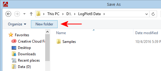 - In the displayed window, browse up one folder level to the LogPlot8 Data folder by clicking on the folder name at the top of the window.