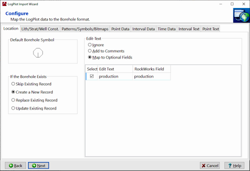 Location tab: Set up the Borehole Symbols , Edit Text, and Overwrite Options