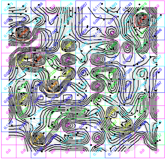 This technique is useful when mapping weighted occurrence data. For example, let's say that we wanted to create a contoured crime map. We would begin by creating an xyz table of individual occurrence data in which the z-value represents the severity of a crime (e.g. parking violation = 0.1, shoplifting = 0.2, violent assault = 0.8, homicide = 1.0). The data would then be gridded in such a way that the grid nodes represent the sum of all control point weights within each cell.