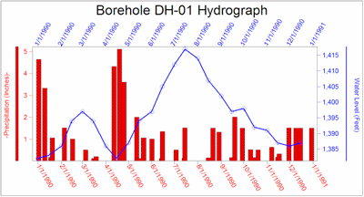 This program is used to read water levels from the borehole database for a single borehole, and precipitation data from the Utilities datasheet, and generate a Hydrograph diagram. This program is very similar to the Utilities | Hydrology | Hydrograph program; the primary difference is that the Aquifers menu program reads the water level data from the "Water Levels" table within the Borehole Manager database.