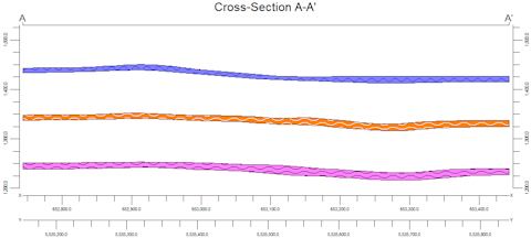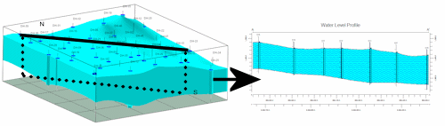 Numerous surface modeling options are offered. The profile can be color- or pattern-filled. Logs can be projected onto the profile using true downhole geometry. The completed profile will be displayed in RockPlot2D. Multiple aquifers are supported.