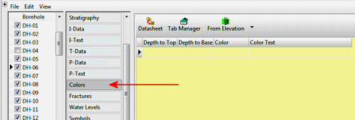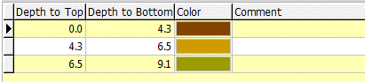 The Borehole Manager’s Colors table is used to enter one or more depth intervals for each borehole and the representative color for the rock, soil, or core sample for that interval. These color blocks can be displayed in 2D and 3D striplogs and log sections. They can be interpolated into a solid color model using the tools in the Colors menu.
