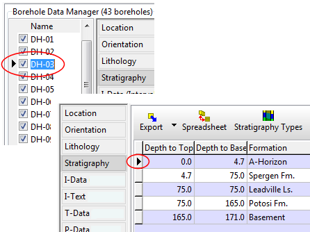 Active Table: The tables for each borehole are displayed in the Borehole Manager window, with tabs noting the table name.