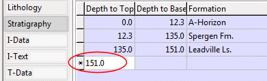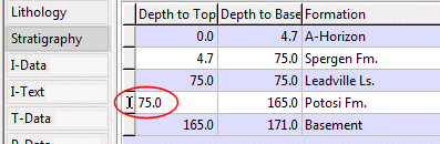 Active Row: When you click on a record in the database, such as the name of a borehole or a row in the Stratigraphy table, the cursor will be shown as a triangle to show the active record.