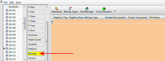 The Borehole Manager’s Bitmaps table is used to enter one or more depth intervals for each borehole and the name of the image to be plotted between these depths, in individual logs and in log cross sections. These can represent raster logs, downhole images, core samples, and more. Raster images are limited to display in vertical logs only in 2D logs and sections (no warping of the image will occur); in 3D, images can be displayed in vertical and inclined holes (not deviated wells).