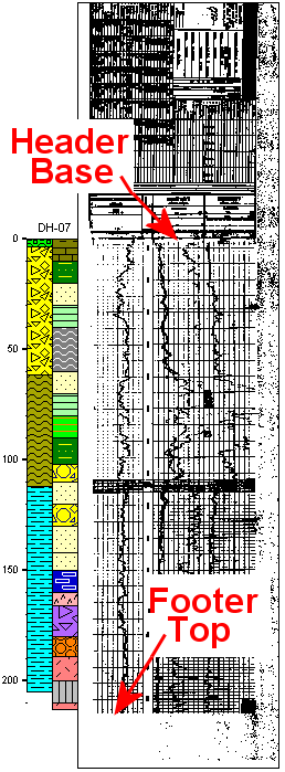 - Header Base: This field is populated by the depth-registration process and represents the pixel (picture element) row to be plotted at the Depth to Top shown to the left. If your bitmap includes extra data at the top of the diagram (e.g. a log header containing textual information about the borehole such as the drilling contractor, column titles, etc), the program will automatically adjust the diagram position by shifting the log such that the proper portion of the bitmap aligns with the depth specified by the Depth to Top setting. Bitmap rows are counted from the top down. For example, the top row is considered to be row zero, while the y-coordinate at the base of the log might be 2000