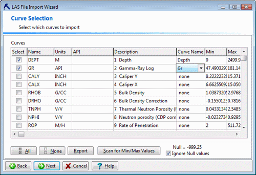 - Use the Scan for Min/Max Values button if you want to see a summary of each curve's data values. If you prefer that any Null values be excluded from the scan summary, be sure the Ignore Null Values box is checked. (Ignore-nulls does not affect the data being imported, just the scan summary displayed here.)