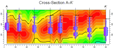 The program will then look at the coordinates specified for the section panels and will construct a vertical profile of each to illustrate the data values, using the selected color scheme. The panels will then be appended together to create the multi-panel section. If you have requested strip logs, they will be appended to the section diagram. (If you did not pick borehole locations as panel endpoints, the program will be forced to choose the closest borehole for the log display.) The completed diagram will be displayed in a RockPlot2D tab in the Options window.