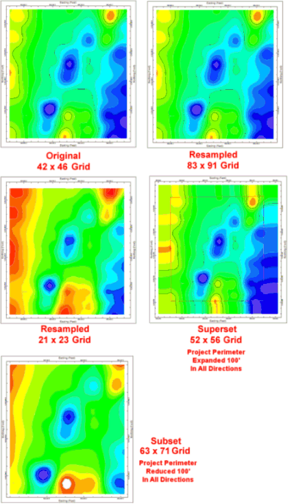 The Grid-Resample program may be used to generate higher- or lower-resolution models based on an existing grid model. It may also be used to create grids that represent supersets or subsets of an existing grid. Grids that are larger than the original grid may suffer from projected edge effects that may be adjusted by changing the search sector angle.