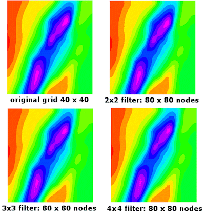 The 2x2 filter is faster while the larger filters provide more smoothing. Filter-based resampling is significantly faster than sector-based resampling but may show some edge effects. In the following example, a grid was resampled to be more dense, using the indicated filters. In the second example, a grid was resampled to be less dense.