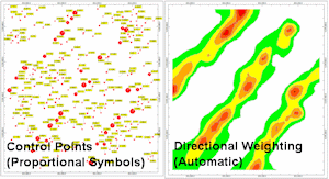 This gridding method uses Inverse-Distance gridding, in which the value of each of the data points is weighted according to the inverse of its distance from the grid node being computed, taken to a user-selected power. The difference with the Directional Weighting scheme is that you can specify a trend direction and strength, and the program will vary the weighting exponent so that points along the trend influence the grid node more than closer points perpendicular to the trend.