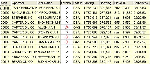 - The program will read the contents of the WCS file and list the wells in rows in the data window. The fields you requested will be listed in the data columns. Well symbol is selected based on a list of status definitions in a "Well Status Table."