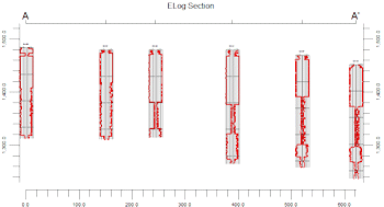 This example shows an elog section created using the Striplogs | 2-Dimensional | Section tool.