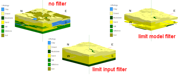 Compare the following diagrams. The first is a lithology model with neither of the above limits enforced. The middle image is an example of the model which results from the Limit Input filter, with Clay, Siltstone, and Soil excluded from the modeling process. The right-hand image is the model which results from the Limit Model filter, with Clay, Siltstone, and Soil removed from the model after it was interpolated (note the holes).