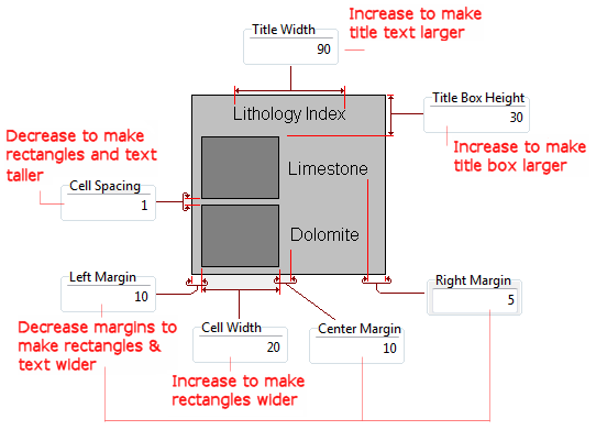 Dimensions: The dimensions are defined as a percent of the size of the legend itself. In this manner you can resize the legend interactively in RockPlot2D (using your mouse) and the components will scale accordingly.