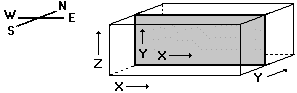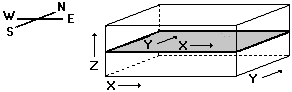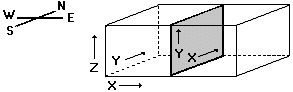 Because of the different orientations of the different slice planes, the X and Y axes of the 2-dimensional slice that is extracted from a solid model are not always going to coincide with the X and Y axes of the solid model. For the north/south and east/west vertical slices, the following drawings illustrate how the program will define the X and Y axes of the 2-D slice it extracts: