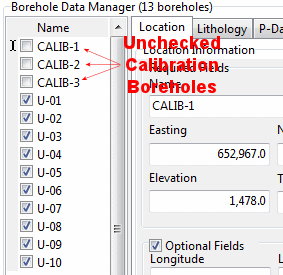 - Disable the calibration boreholes (which do contain lithology) by removing checks from the boxes next to their names.
