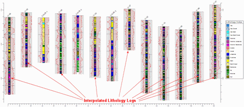 The program will read each active borehole's selected P-Data tracks. At each specified depth interval it will determine the closest P-Data measurements and then refer to the predictive model as a "look-up" reference. The lithology type stored for that P-Data pair will be recorded for that depth interval in the borehole's lithology table.