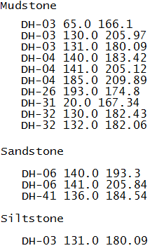 - List Outliers: Check this option to include information about "outliers". These outliers represent P-Data measurements that lie outside a statistical range, as defined under Outlier Thresholds, above. For each lithotype, the program will list the borehole ID, depth, and P-Data values.