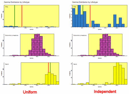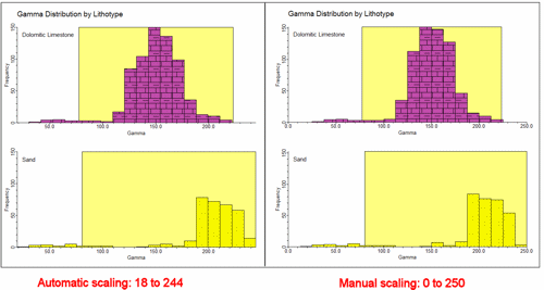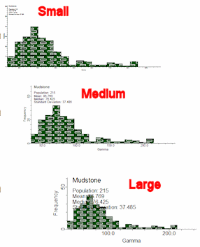 - Independent: Choose this option if each histogram for each lithology type is to be scaled independently for the vertical axis. This can be helpful if you have some lithotypes which skew the scale to a high frequency range, rendering others barely readable. Just remember that the scale for each may be different as you view the analyses.
