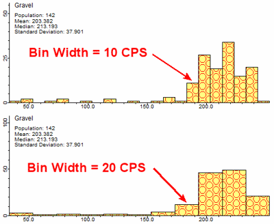 - Manual: Choose this option to set the width of the histogram bins using actual P-Data units. For example, a bin size of 20 would equal 20 counts per second when processing Gamma data.