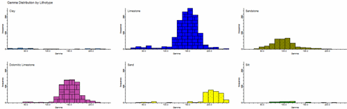 Use this program to read the values in a P-Data column and generate a series of frequency histograms that display the distribution of these values for each lithology type recorded downhole for the active boreholes in the project. The diagrams are generated on a single page for quick comparison. You can generate diagrams for all or for selected lithology types. The resulting diagram is displayed in a RockPlot2D pane within the Options window.