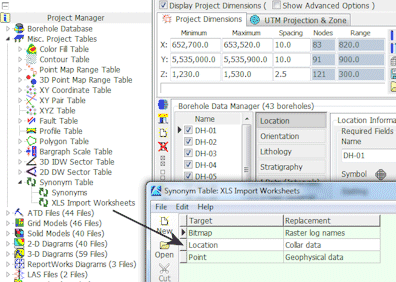 This set of RCL commands replicates the File | Import | Excel | Multiple Tables menu option in the Borehole Manager. This tool can read data from multiple worksheets in a single XLS file and map these worksheets to different tables in the borehole database. For example, the information in the "Location" worksheet in the Excel file can be mapped to the database's "Location" table, and the data in the "Stratigraphy" worksheet to the "Stratigraphy" table.