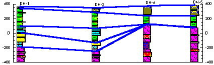 New Graphic: Creates a new plot containing only the graphic representation of the Digitized items (points, lines, polylines, and/or polygons) listed in the data window, using the styles and colors established under File | Options | Measure/Digitize Options. The new graphic can be saved as a Rw2D file (File | Save), appended to another Rw2D file (File | Append), and so on. Below is an example of digitized correlation lines saved as a new graphic, on its own: