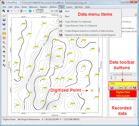 ! The digitized or measured data items are not stored in the graphic Rw2D file. You need to use the data tools shown above to save the data in a file, to store the data in the clipboard, or to record the data as graphic entities before closing the plot window, or you'll lose all of the data items.