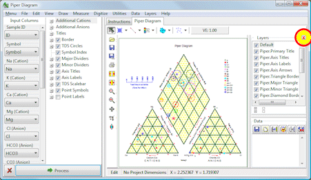 ! To close the data pane portion of the RockPlot window, click on the red "X" button shown below. To re-display the data pane, click the "+" that's displayed in its place.