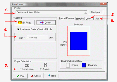 When you select this option, you'll see the following Print Options window. The settings are shown in this graphic, and are explained in the topics below. You should follow the recommended steps to be sure that the printer, paper size, orientation, and scaling are correctly established.