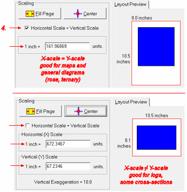 - If you are printing a cross section, and the section is plotted on the screen at a vertical exaggeration of 10, then the default setting in the Print window will be Horizontal Scale = Vertical Scale checked OFF, and the vertical scale will be 1/10th the horizontal scale.