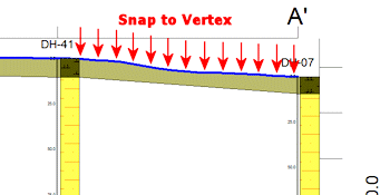 If you are editing a cross section diagram that contains lithology or stratigraphy logs, you can hold down the Ctrl and the Shift keys to tell RockWorks to snap the next vertex that you draw to the closest "smart snap point" in the logs. All 2D lithology and stratigraphy log columns contain these smart points at the corners of their fill intervals; you can display them in RockPlot2D using the View | Show Smart Snap Points menu option or by typing Ctrl+Alt+S.