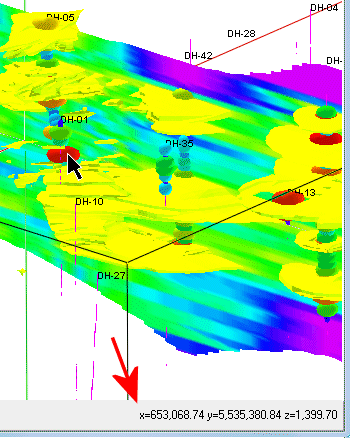 Refer to the X, Y, Z listing at the bottom-right corner of the RockPlot3D window to view the world coordinates of the current mouse location. Note that the coordinates will be displayed for actual objects in the view only - coordinates cannot be polled for blank space.