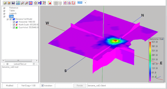 In the example below, one N-S vertical slice, one E-W vertical slice, and one horizontal slice have been added to a solid model representing Benzene concentrations. The isosurface itself is set to a Draw Style of "Hidden" so that the slices are visible.