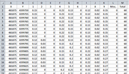 Here's an example of a report copied from the text editor into Excel. The first two columns contain the X and Y coordinate locations for the column of node values. The next columns list the G-Values you requested in the datasheet (example above). The Misc column will list the null values, and the Total column the number of nodes.
